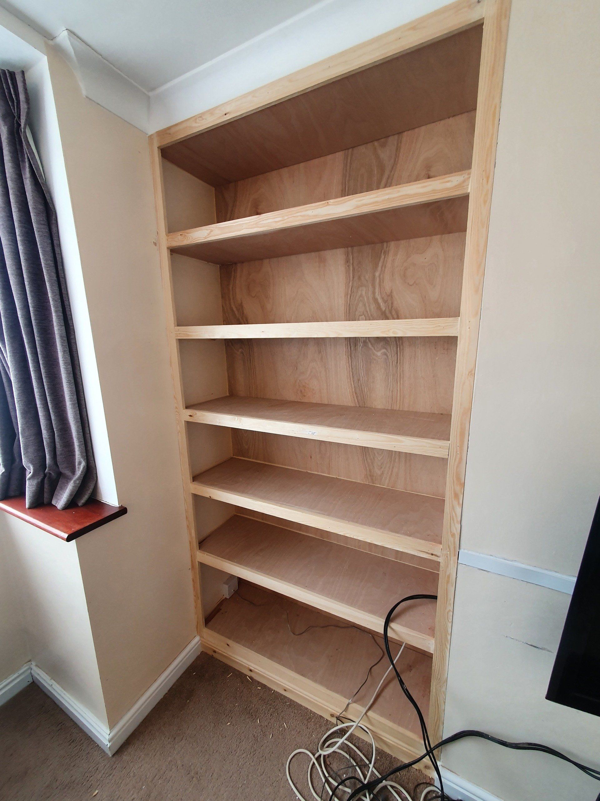 Built bespoke shelving to the customer's exact requirements, including new hidden electric sockets, coving and skirting