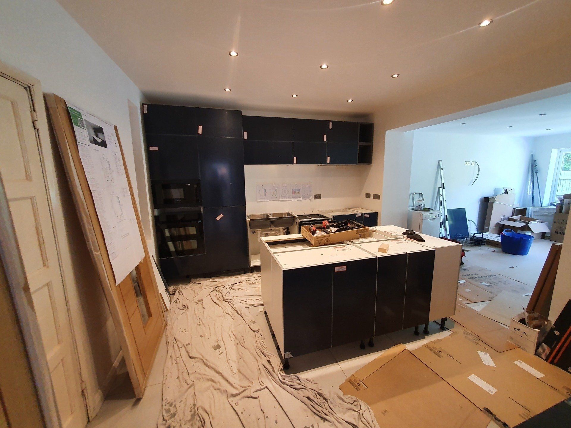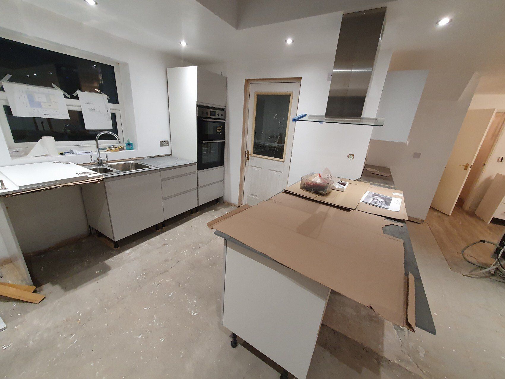 Kitchen renovation including new wall and floor units, sink installation, mitre joint and breakfast bar