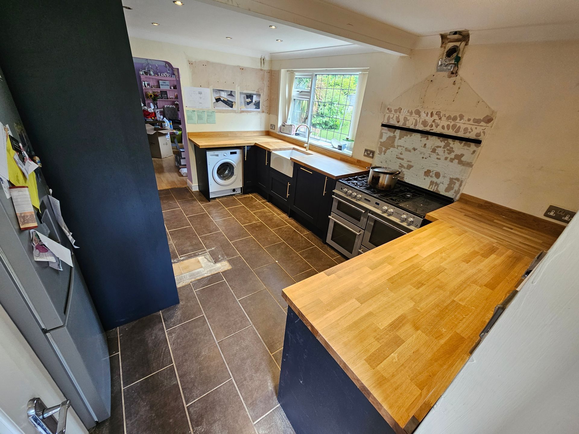 Howdens kitchen fitting with oak worktops and belfast sink (image 3 after)